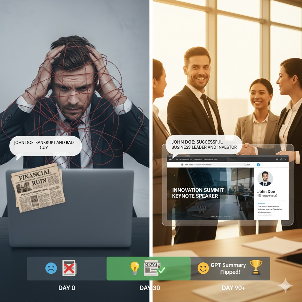 Within 90 days, ChatGPT’s summary flipped – now it describes him as a “successful business leader and investor.”