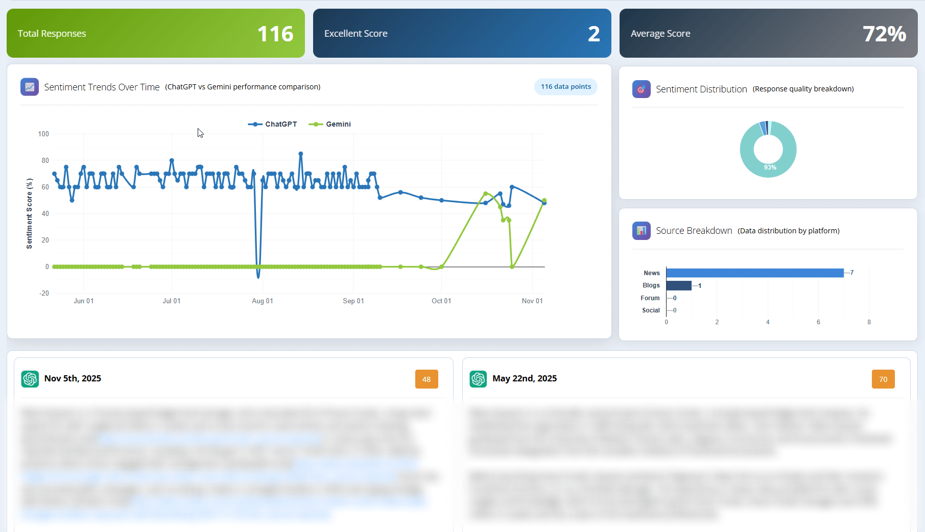 We don’t just promise improvement — we show it in the data. You’ll see sentiment scores rise and negative mentions disappear as your reputation improves across AI systems.
